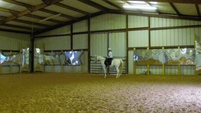 The indoor arena is a 60 x 60 square arena with a large fan with 14 ft fan blades, perfect for improving your 20, 15 or 10 meter circles, your corners or checking your shoulder-in for accuracy as you head towards the corner mirrors. It is perfect for riding inside on very hot or rainy days. It's also a great area to lunge your horse. The footing is good cushion sand and is designed for comfort and safety.